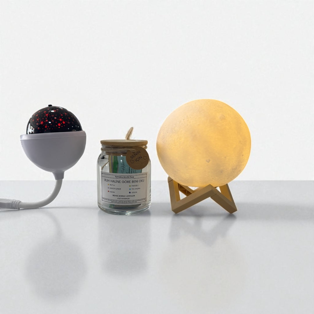 3'lü Hediye Seti (Ayet Kavanozu - Ay Işığı Lamba - 3x3 Işıklı Küre)