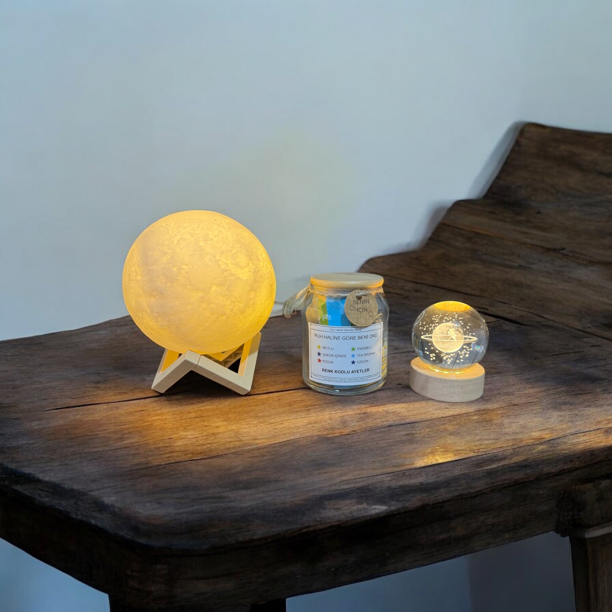 3'lü Hediye Seti (Ayet Kavanozu - Ay Işığı Lamba - 3x3 Işıklı Küre)