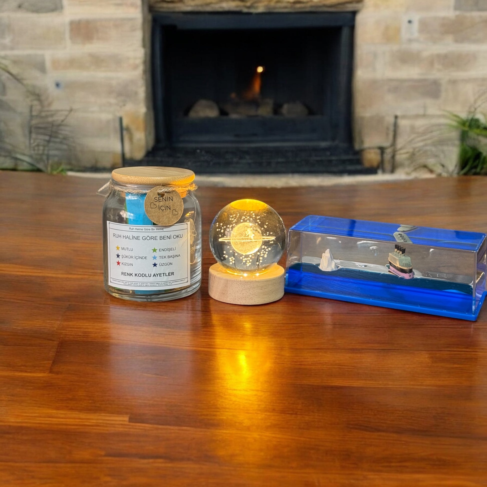 3'lü Hediye Seti (Ayet Kavanozu - Batmayan Gemi - 3x3 Işıklı Küre)
