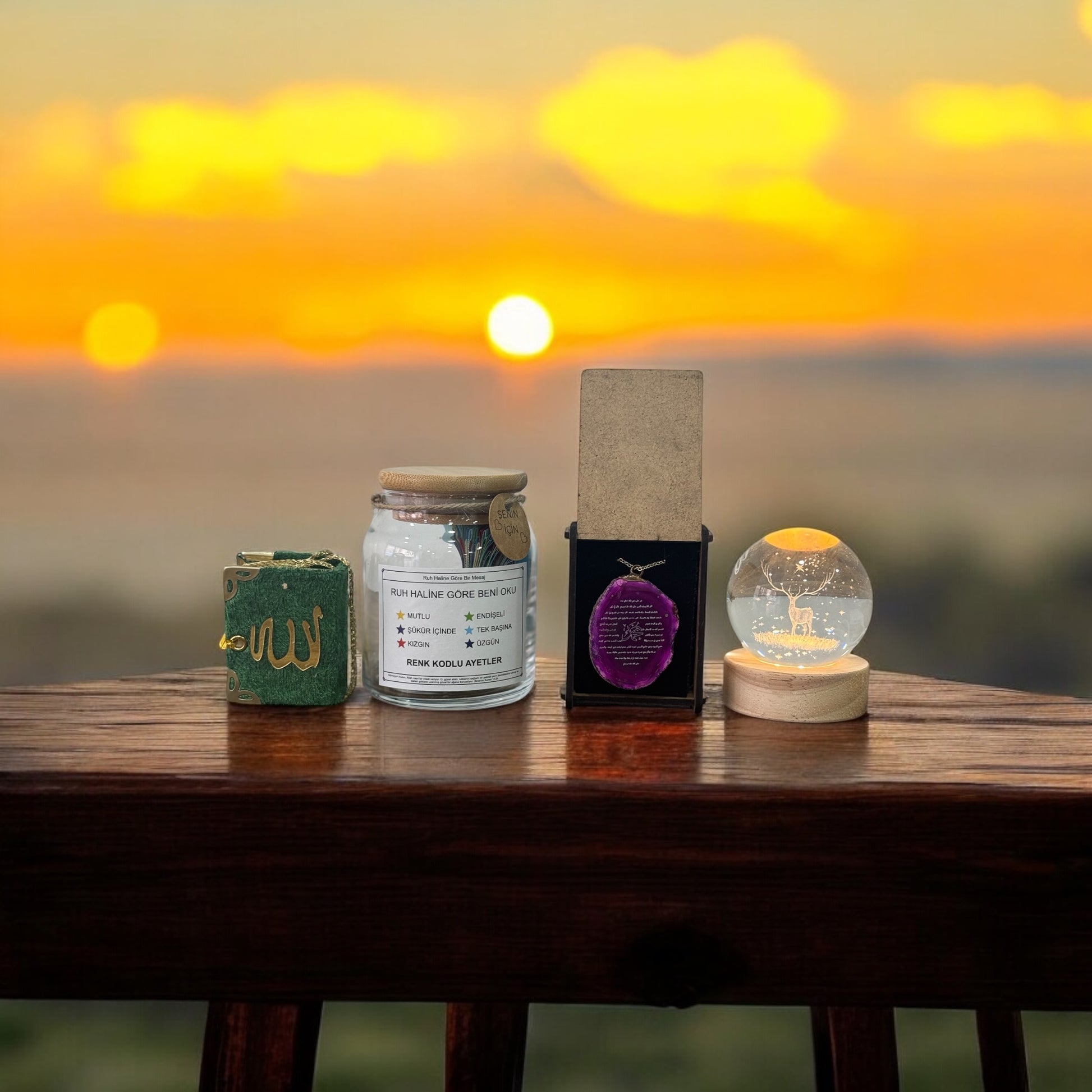4'lü Süper Hediye Seti (Ayet Kavanozu - Kolye - 3x3 Işıklı Küre - Mini Kur'an-ı Kerim)