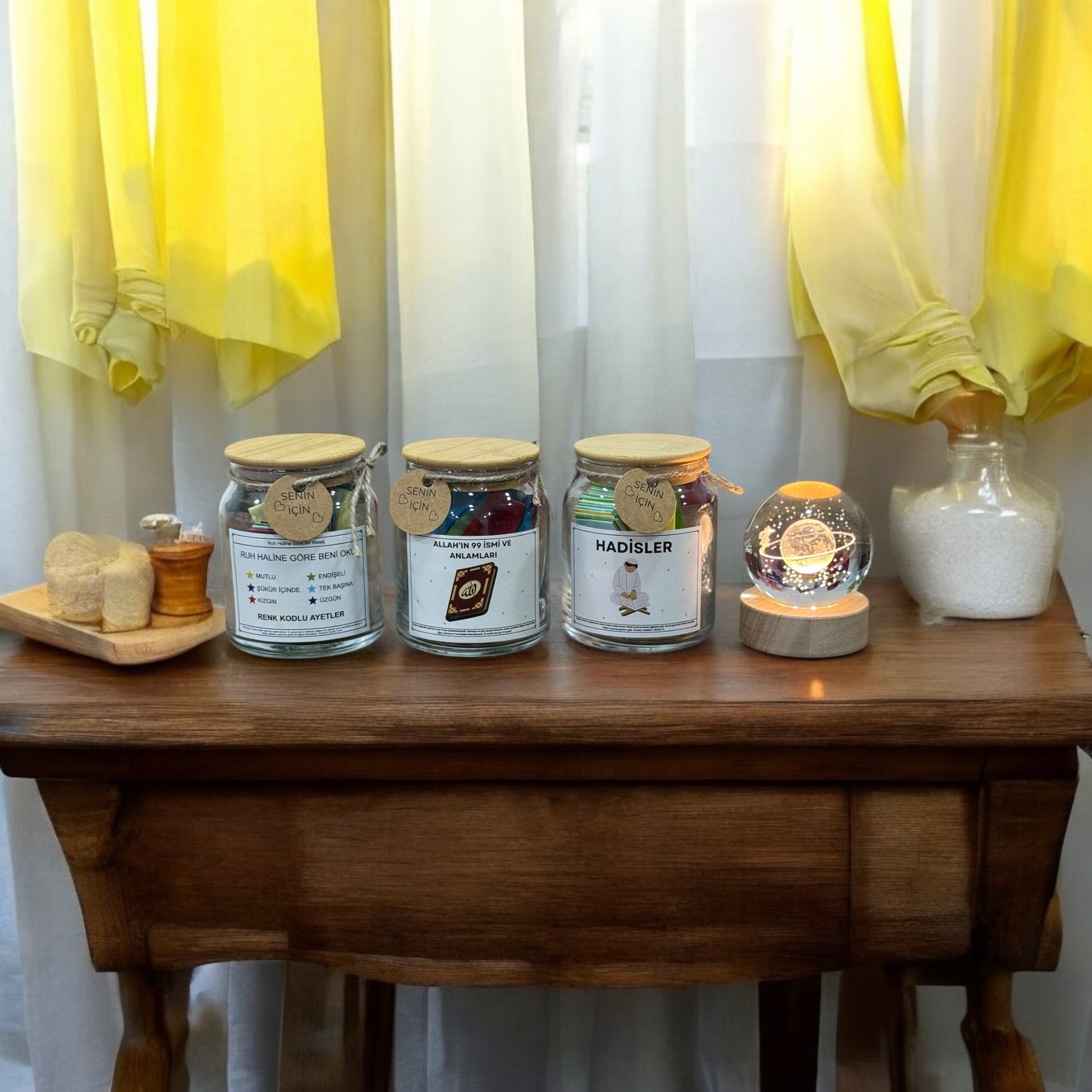5'li Harika Hediye Seti (Ayet Kavanozu - Hadis Kavanozu - Esmaül Hüsna Kavanozu - 3x3 Işıklı Küre - Firdevs Kokusu)