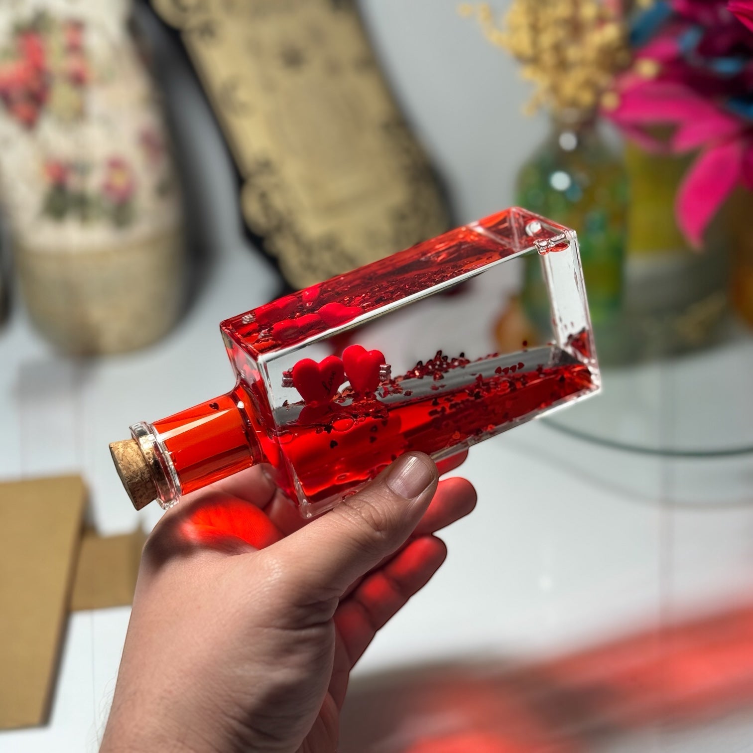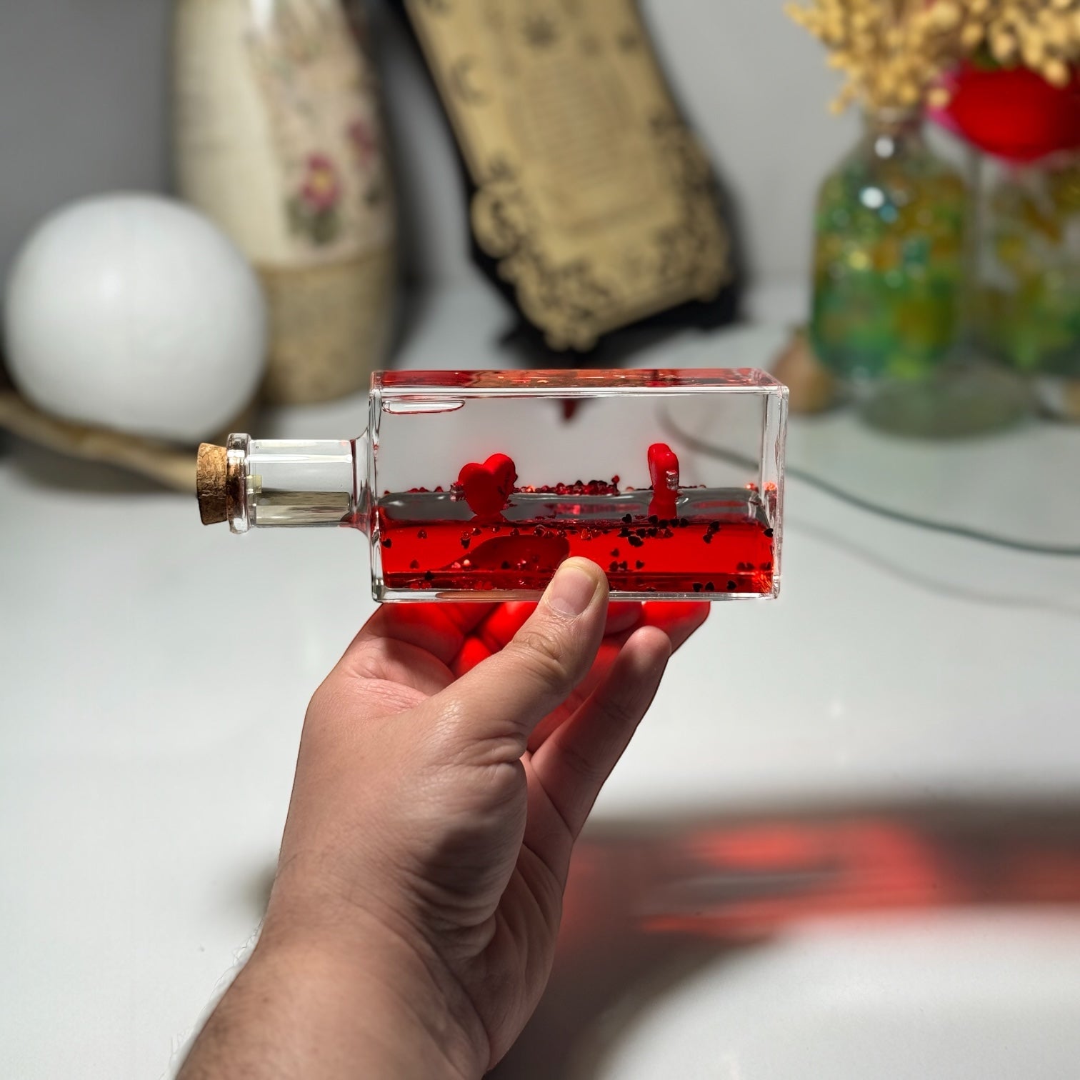 Aşk Şişesi, sevginizi en zarif şekilde ifade etmek için tasarlanmış eşsiz bir hediye! İçerisindeki kırmızı sıvı ve yüzen kalpler, duygularınızı simgelemenin romantik bir yolu. Dekoratif tasarımı sayesinde hem evinizin atmosferine sıcaklık katar hem de sevdiklerinize unutulmaz bir hediye alternatifi sunar.