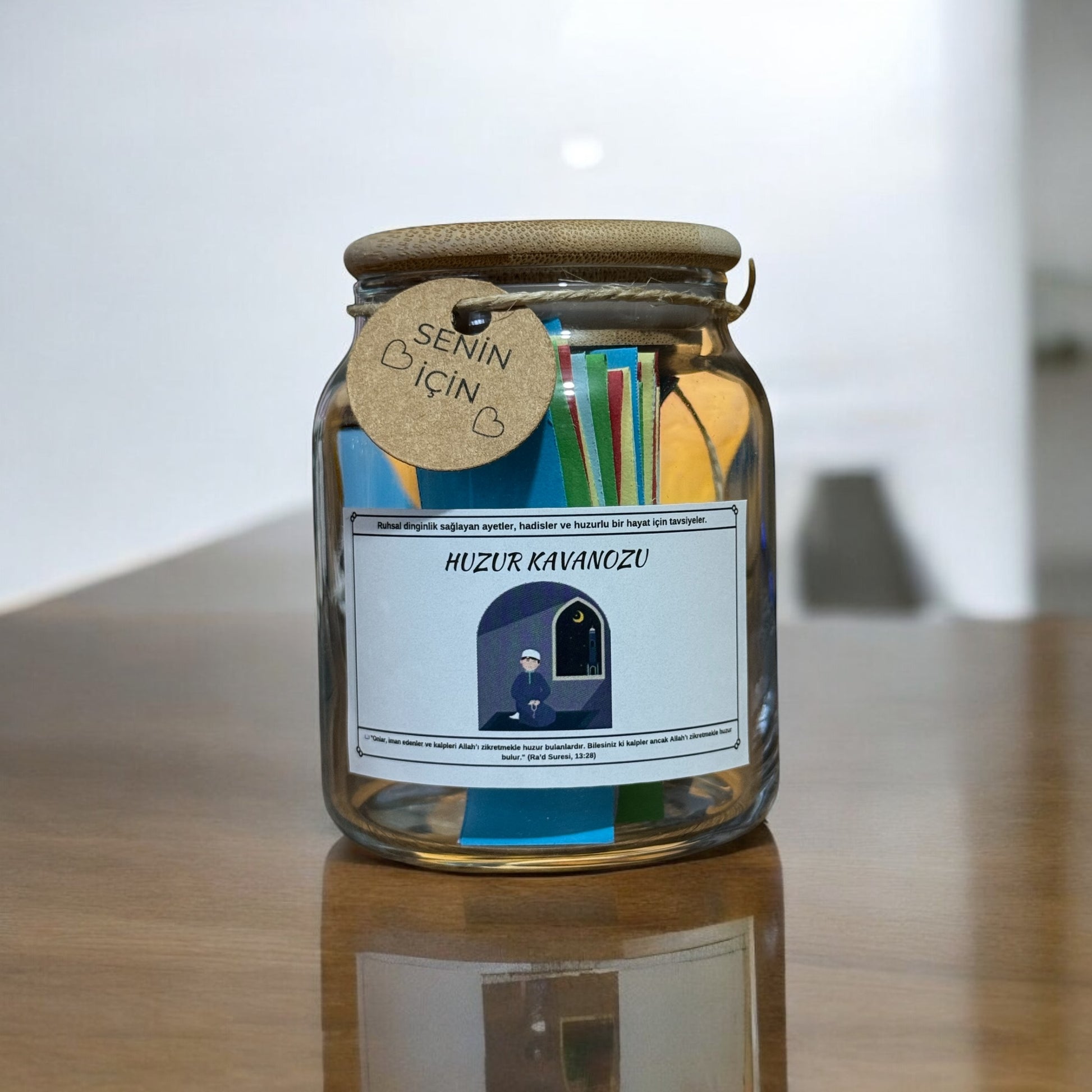 🌟 Huzur Kavanozu ile hayatınıza dinginlik ve manevi bir huzur katın! İçerisinde 40’tan fazla huzur verici ayet, hadis ve ilham veren sözler bulunan bu kavanoz, ruhunuzu yatıştıracak ve kalbinizi ferahlatacak. Taşınabilir tasarımı sayesinde dilediğiniz her yere yanınızda götürebilirsiniz.