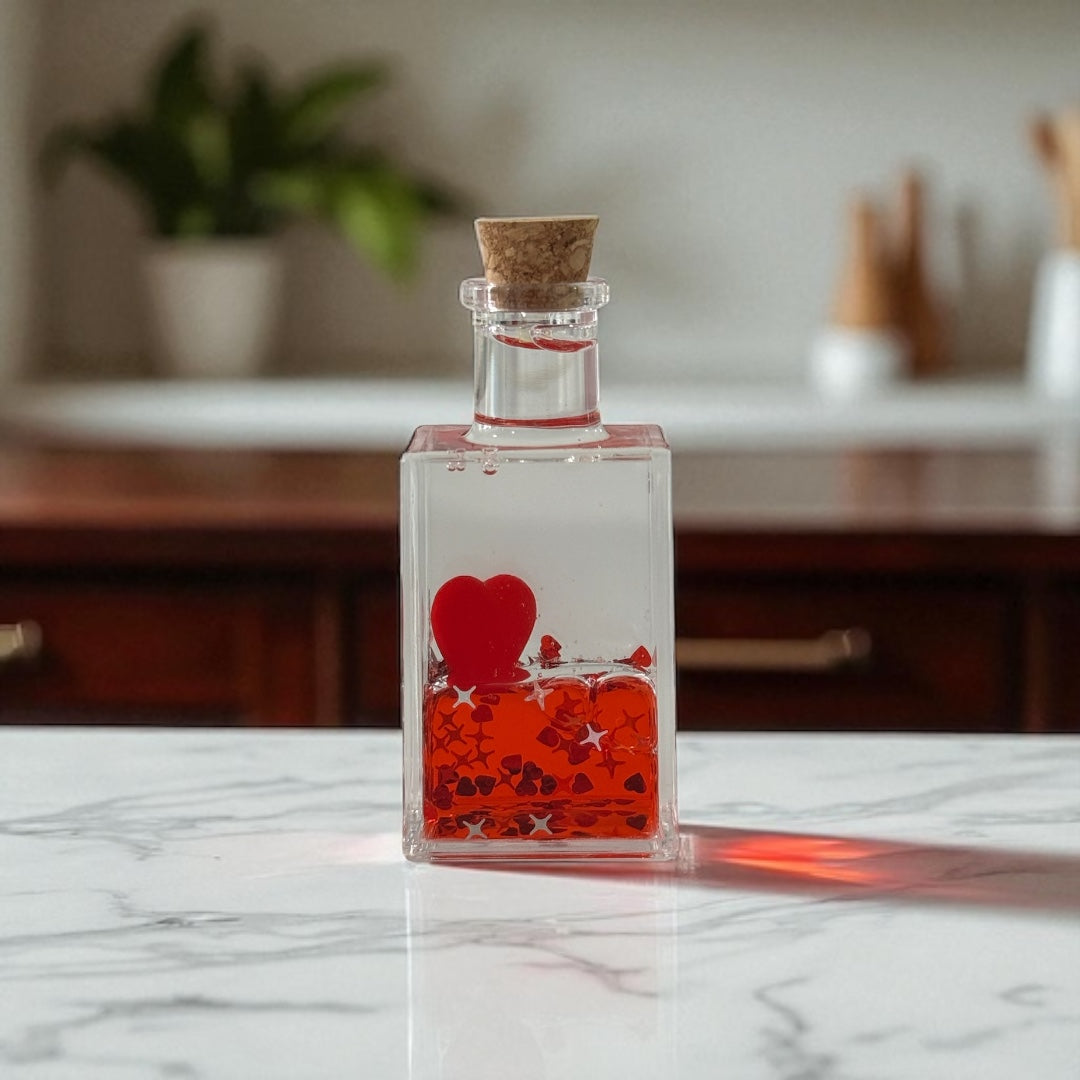 🌹 Zarif Tasarım – Şık cam şişe ve içindeki aşk simgeleriyle dikkat çeken estetik görünüm.